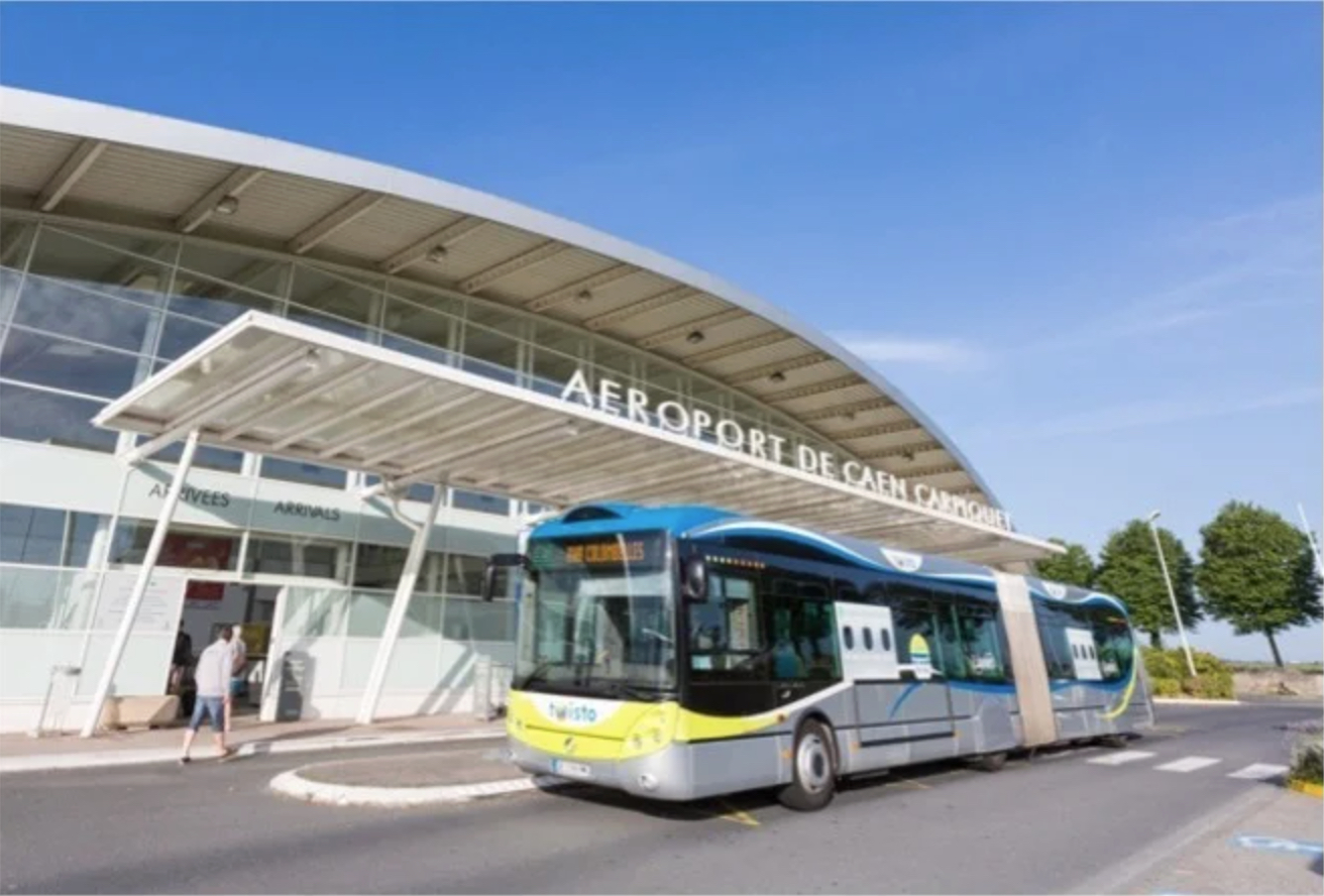 Le réseau de transport urbain Twisto relie l’aéroport au centre-ville de Caen puis à Hérouville Saint-Clair.